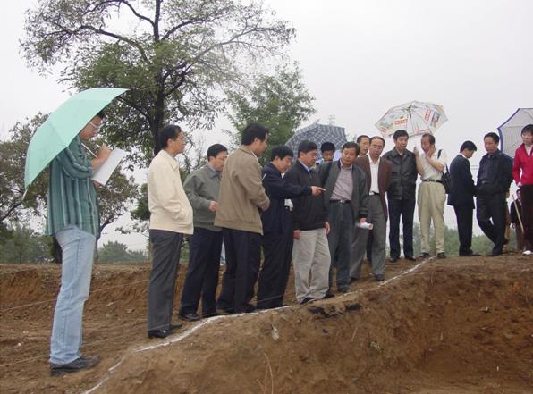 在唐大明宮丹鳳門(mén)遺址發(fā)掘現(xiàn)場(chǎng)接受國(guó)家、省文物局領(lǐng)導(dǎo)的視察和檢查(2005年)