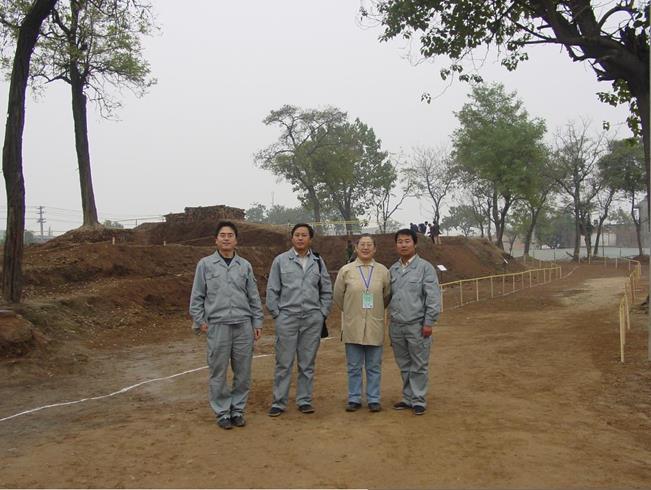 西安唐城隊(duì)隊(duì)員與安家瑤老師在唐丹鳳門(mén)遺址發(fā)掘現(xiàn)場(chǎng)(2005年)