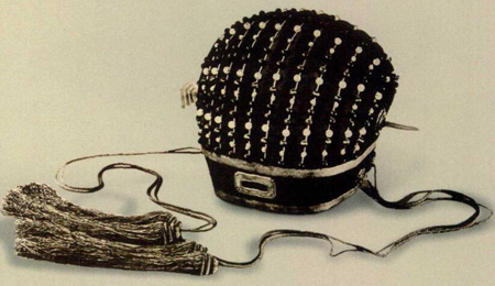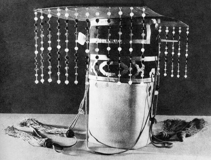萬歷帝棺內還出土了一件皮弁,胎為細竹絲編結成六角形網狀作胎,上髹黑漆,內襯紅素絹一層,面敷三層黑紗,口里側襯一層紅素羅??谘赝庥媒鸩N金箍一道。皮弁前后各十二縫,每縫內釘包金竹絲一縷。縫中各綴玉珠九顆、珍珠三顆。玉簪一件,為二段,每段各有穿孔兩個,備穿線系結。系于簪兩端的紅色圓絳帶通長115、纓長7.8厘米。