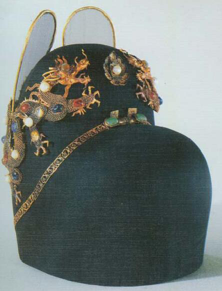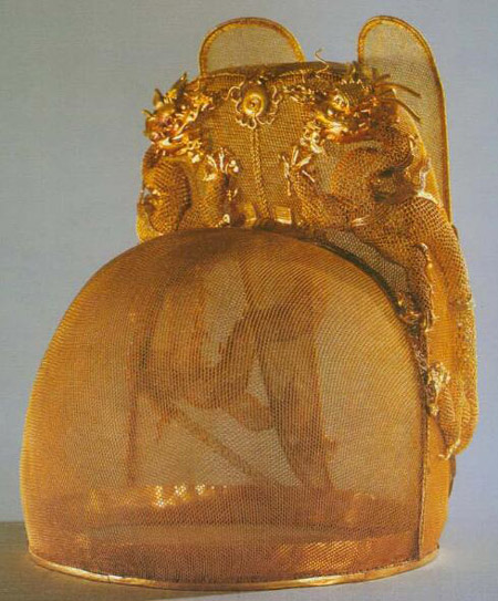 翼善冠為皇帝常服時所戴,定陵共出土3頂,形制相同,只是質料不同,一頂為金翼善冠,兩頂為烏紗翼善冠,其中一頂戴在萬歷帝頭上。金翼善冠全部用金絲編結而成,通高24、冠口徑20.5厘米。由前屋、后山(分前后兩片)、角三部分組成。后山飾雙龍戲珠。金冠的制作采用掐絲、累絲、碼絲、焊接等多種工藝,是明代金銀制作工藝最高水平的杰作,也是迄今為止我國現存唯一的帝王金冠。萬歷帝頭戴的烏紗翼善冠,后山前面嵌二龍戲珠,龍身用金壘絲編結而成,并鑲嵌有各色寶石。金色龍身搭配黑色紗面,極富動感。