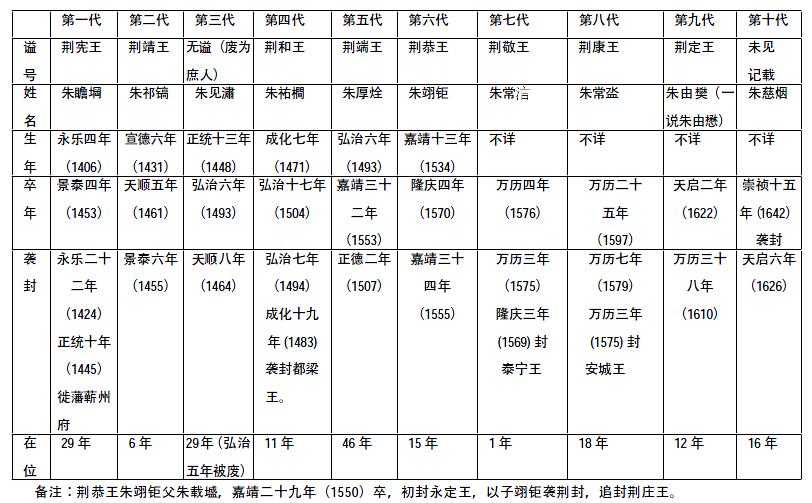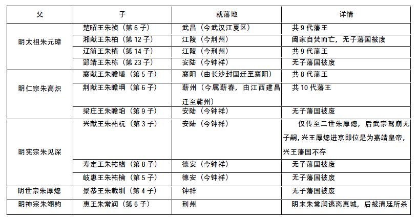 湖北境內(nèi)共有藩王44位,先后累計(jì)受封藩號(hào)12個(gè),其中以就藩蘄州的荊藩王傳承世代最久,自明仁宗朱高熾庶六子朱瞻堈永樂(lè)二十二年(1424年)封荊王,宣德四年(1429年)八月就藩江西建昌府起,至崇禎十五年(1642年)張獻(xiàn)忠攻入蘄州城,火燒荊王府,共傳10代。其下又分封郡王十一支,郡王之下又有將軍、中尉數(shù)十人,形成了龐大的荊藩體系。