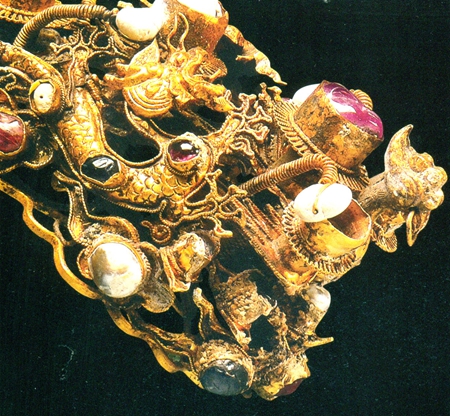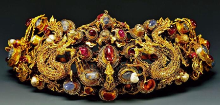 金鑲寶龍鳳鬢釵(一對(duì)),長(zhǎng)20.2厘米。用金絲在底板上纏繞出卷云紋,一前一后兩只鳳凰,被兩條龍簇?fù)碇?,穿花而過(guò),龍身下是鑲嵌紅、藍(lán)寶石的流云。菊花的花心及龍身上嵌入寶石、珍珠,花叢中同樣伸出數(shù)枝金絲繞成的彈簧,枝頭飾珍珠,搖曳生姿。