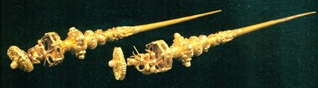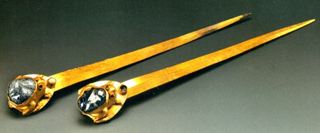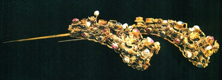 金鑲寶龍鳳分心長(zhǎng)14厘米,簪首中部為一只金鳳,口中銜環(huán),雙翅展開(kāi),翅膀上鑲嵌藍(lán)寶石,鳳首上方,各色嵌寶石花朵組成鳳尾。金鳳兩側(cè)各一條龍,龍身累絲而成。花叢中伸出由金絲繞成的彈簧枝,上飾珍珠,增加了動(dòng)感。背后以一根窄金條橫貫為撐,中間垂直焊接簪腳。這一造型左右對(duì)稱,華貴大方,動(dòng)靜結(jié)合。