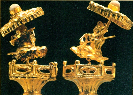 如金鑲寶珍珠仙人乘鶴簪(一對(duì)),長(zhǎng)14.7厘米,簪首上欄桿中立一圓形傘蓋,下為一騎鶴仙人,一仙人吹笛,一仙人持漁鼓,傘蓋和仙鶴下均為彈簧,增加動(dòng)感。角臺(tái)下是四朵花組成的大花球,花心處各嵌一顆珍珠。簪首和簪腳以龍頭相連。另一對(duì)金鑲寶蛙形小插,長(zhǎng)14.9厘米,簪首為一只青蛙趴在桃心形葉片上,蛙身鑲嵌藍(lán)寶石,葉尖處則嵌小珍珠。
