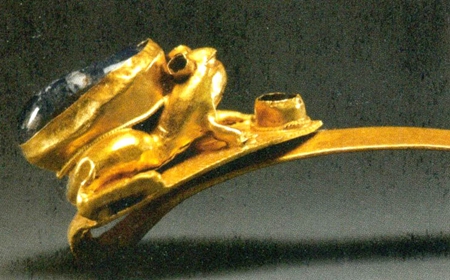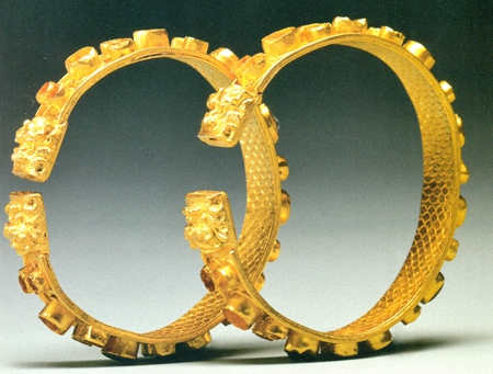 荊恭王墓中的一對(duì)金鑲寶龍首鐲,直徑為7厘米、寬1.3厘米。鐲子頭部鏨刻龍首,鐲子身上鑲嵌紅、藍(lán)寶石,鐲子內(nèi)部鏨刻鱗紋。樣式雖簡(jiǎn)單,但仍貴氣十足。