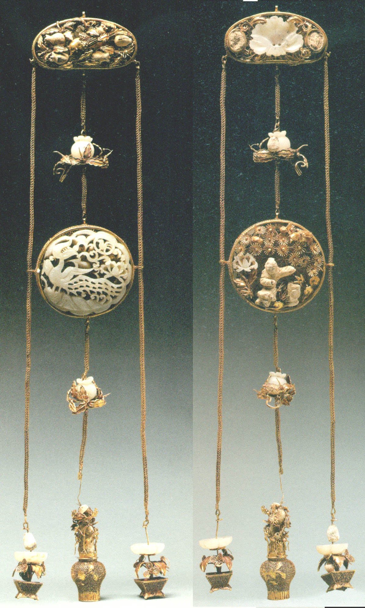 另外,荊恭王墓中還隨葬了金鑲玉七事。通長(zhǎng)28.7厘米。頂端為橢圓形云題,一面嵌一朵玉牡丹花,兩邊各有一個(gè)石碗,內(nèi)鑲珍珠。另一面紋樣為金雀鳥(niǎo)與石榴。云題下為三根金鏈,兩側(cè)金鏈各懸掛一個(gè)金鑲玉花籃,上托一朵白玉小花。中間的金鏈上綴一金鑲玉云板,云板一面鑲鏤雕玉鳳鳥(niǎo),另一面松樹(shù)下,一人倚在竹旁,身邊一朵白玉雕菊花。玉板上下各有一顆金鑲玉石榴,末端綴一金累絲花瓶,花瓶上用金絲做出竹葉、梅花、松葉等,花瓶?jī)?nèi)插寶石。