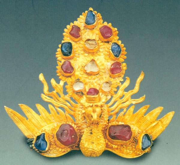 鑲寶石金鳳簪一件,鳳高3.8厘米,簪身長(zhǎng)11.1厘米。金鳳昂首,展翅,細(xì)頸,上有火焰形冠。金鳳尾部錘揲成11朵花形,頸部向后回伸,頸、胸、腹和翅膀等部分外表為鱗狀毛片飾,翅膀羽毛如刀形,翅膀和尾羽上均鑲嵌有紅藍(lán)寶石。