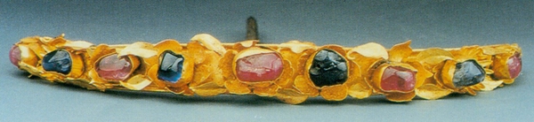 花鈿共出土兩件,一件為鴛鴦戲蓮紋花鈿,通長(zhǎng)11.8厘米。兩端為蝴蝶,中間為鴛鴦、蓮花并配以草葉,邊緣飾以聯(lián)珠紋。另外一件為鑲寶石花鈿,簪身長(zhǎng)8.9厘米。呈弧形環(huán)帶狀。焊接菊花、牡丹花,嵌紅藍(lán)相間寶石9顆花蕊,配以小金葉。