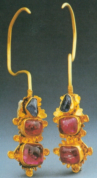 鑲寶石金耳墜一副,通長(zhǎng)7.45厘米。上部為“S”形金鉤,下部連綴一蝴蝶兩朵花,蝴蝶腹部和花蕊中部均鑲嵌有寶石。