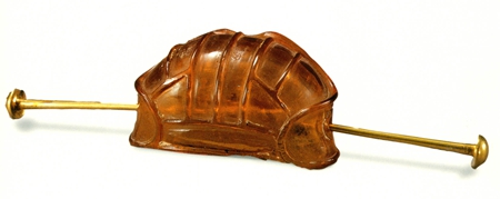 琥珀發(fā)冠1件,長6.8厘米,高3.7厘米。血紅色,中空,上飾五道直梁,兩側(cè)各有一相對(duì)小孔,對(duì)插圓頭金簪一對(duì),簪子長11.2厘米。