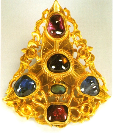 鑲寶石金頭飾一件,高7.7厘米,寬6.8厘米。整體呈三角形,在鏤空的纏枝葉上鑲嵌有紅寶石、藍(lán)寶石、綠松石和茶晶,均有金托。寶石間有四個(gè)孔雀的金托,為鑲嵌珍珠之用,珍珠已朽。