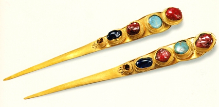 鑲寶石金簪1對(duì),通長17、17.2厘米。簪首有五個(gè)金托,托邊有金絲編織的聯(lián)珠紋一周,托內(nèi)鑲嵌有紅寶石、藍(lán)寶石、綠松石。一托內(nèi)鑲嵌物,可能為珍珠,已朽。