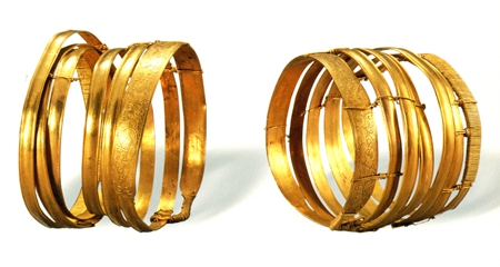 金釧一副,高4.4-5.8厘米,直徑7.1-7.8厘米。用扁金盤成七圈,每圈用四道金絲相連,上下兩頭左右可活動(dòng)以便松緊,一頭以金絲相纏,一頭扁金面上陰刻纏枝蓮、牡丹紋。