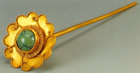 鑲綠松石金簪、鑲貓眼石金簪各一件,簪首形制相同,均為花瓣形,中心鑲嵌綠松石或貓眼石。