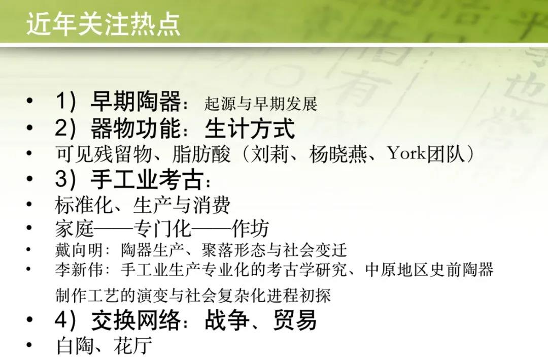 在重點闡述陶器考古與古代文化、經(jīng)濟、技術(shù)、社會的關(guān)系之后;王老師介紹了目前陶器研究的一些熱點問題,包括:1)早期陶器的起源與發(fā)展、2)器物功能與生計方式、3)手工業(yè)考古、4)交換分配等。